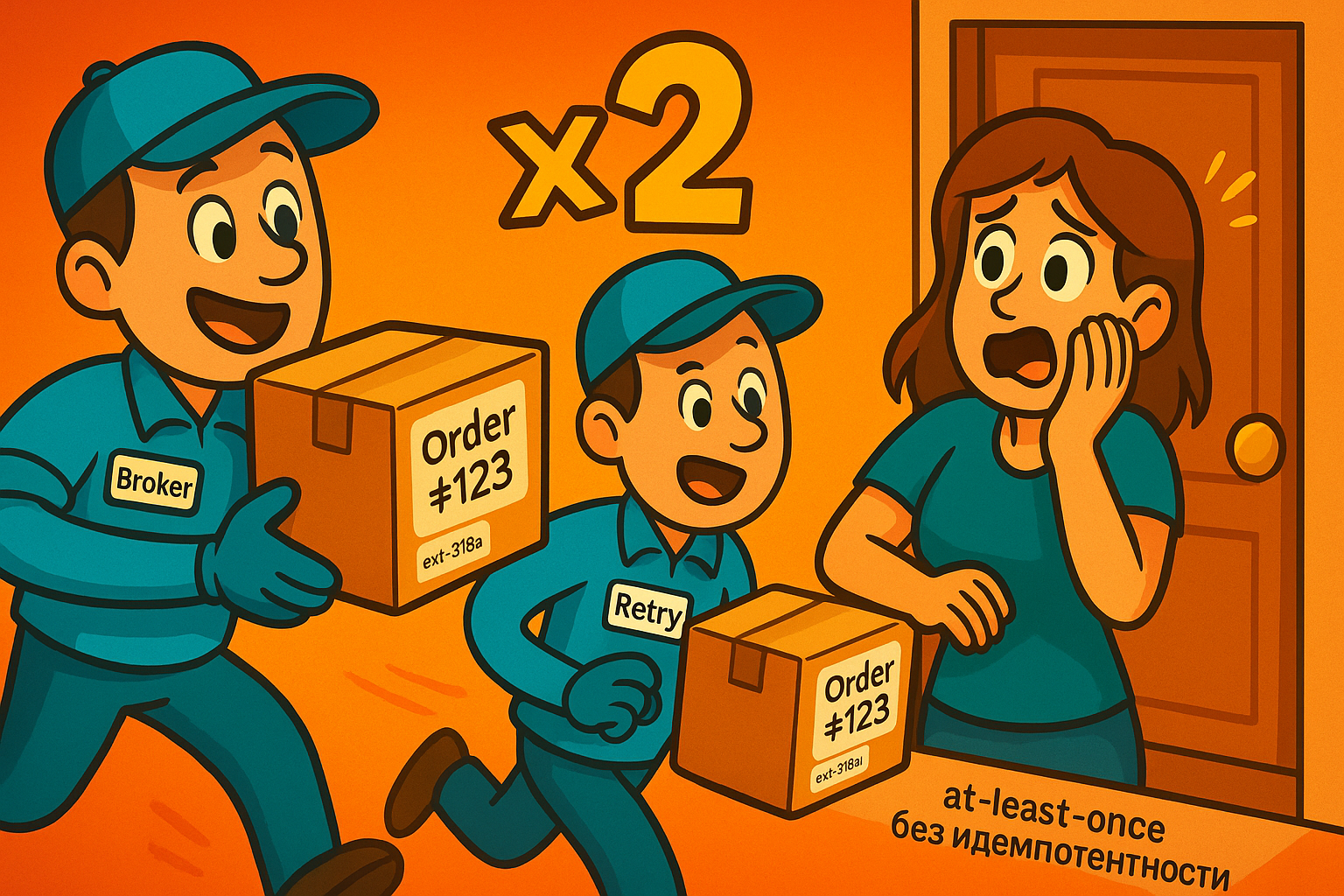 - At-least-once — «как минимум один раз»: сообщение не потеряется, но возможны дубликаты.