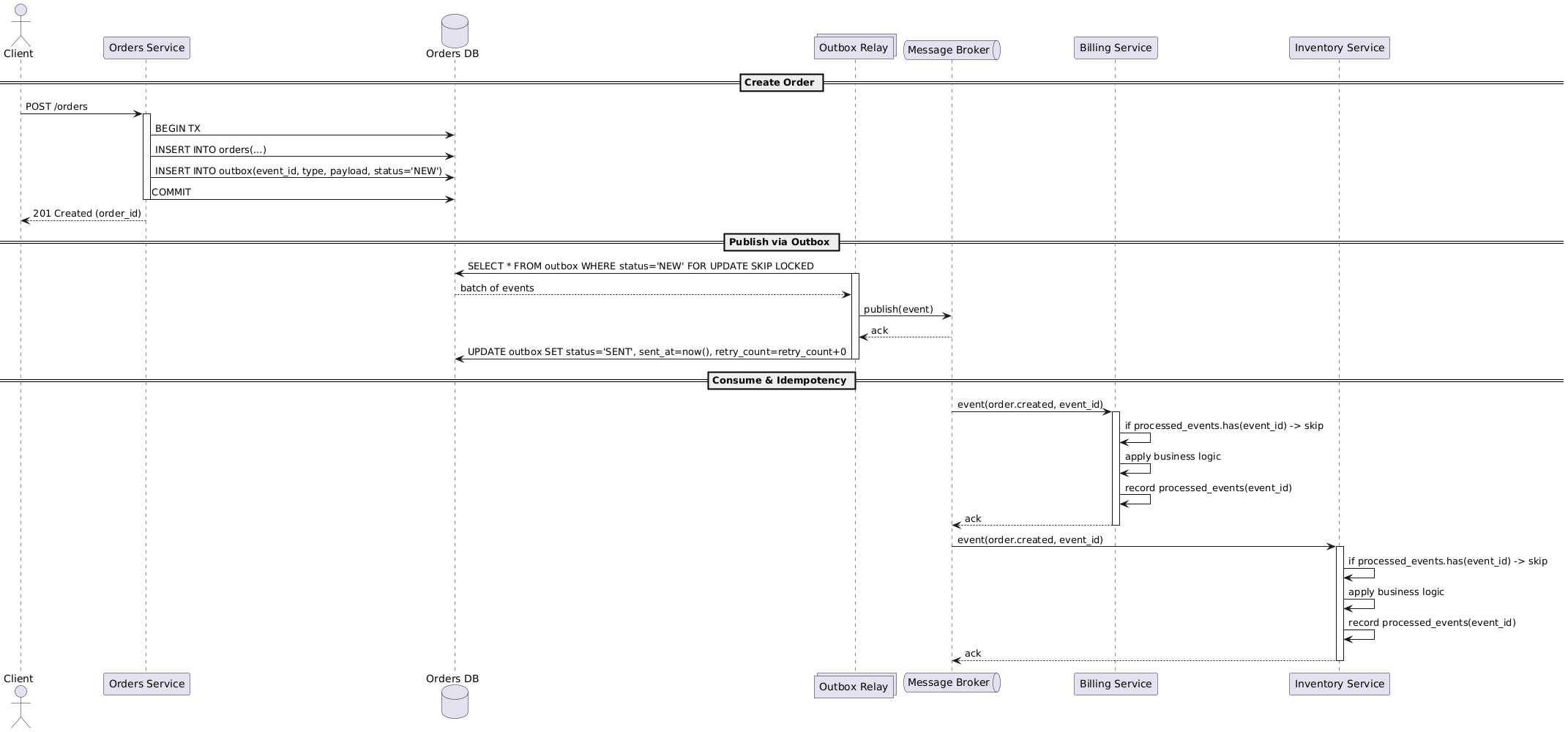 - Consumers — Billing/Inventory и др. с идемпотентной обработкой.