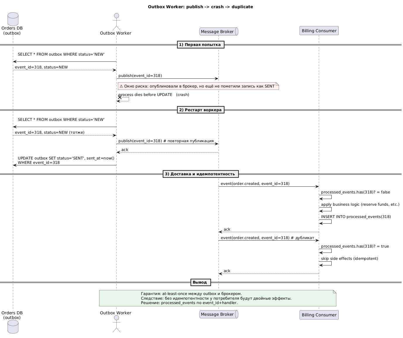Outbox обеспечивает атомарность между заказом и записью события в БД. Но между Relay и брокером единой транзакции нет. Если вычитывающий воркер опубликовал в брокер и упал до UPDATE outbox SET status='SENT', то после рестарта событие будет отправлено ещё раз. Это ожидаемая цена at-least-once.